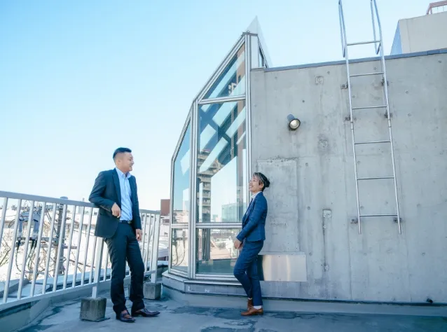 通勤時の服装やヘアスタイルは自由。男性はオフィスではスーツ、現場では作業着を着用しています。初対面の人に会う機会が多いため、エチケットとして清潔感のある身だしなみを心がけています。