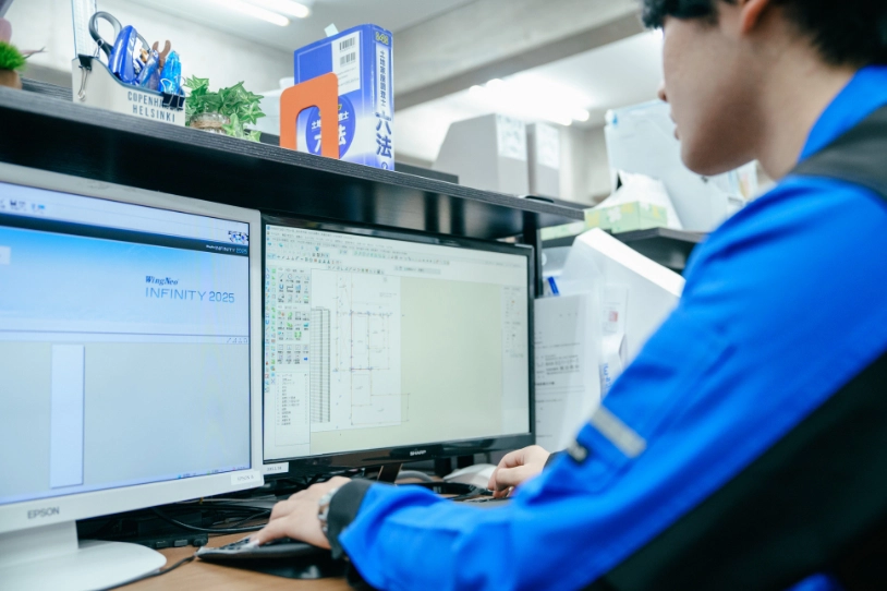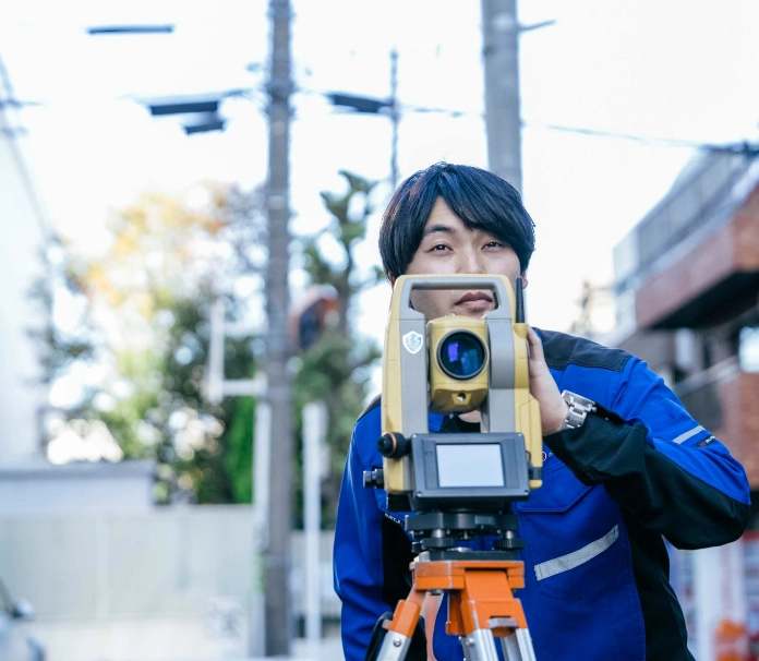 土地家屋調査士の資格をいかして、確定測量業務と登記業務を行なっています。測量の現場では、境界について法律や根拠に基づいてわかりやすく話をし、近隣の方に理解していただくことを心がけています。また数学が得意なので、測量の作業で正確な数字を出すのはもちろん、測量方法の仕組みから効率的なやり方を常に考えながら作業しています。理論に基づいた正確な測量と、相手の立場に立ったコミュニケーションをとること。その両方を大切にした確定測量が強みです。