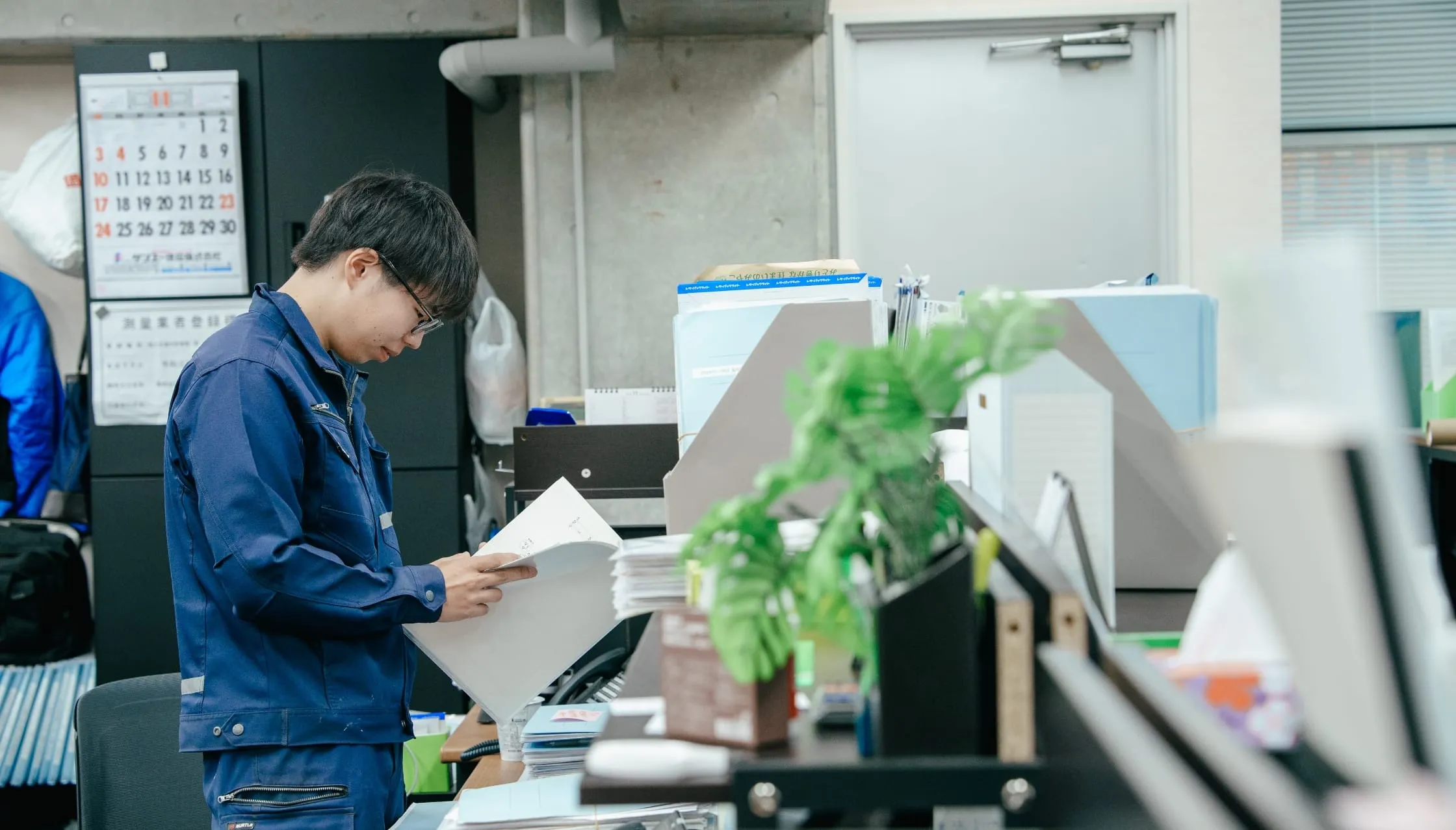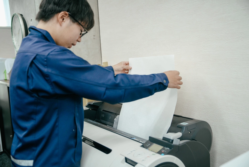 1日の流れとしては、出社して現場の準備をし、別の担当者と一緒に車で現場に向かい作業をスタート。昼食を挟んで現場作業を続け、夕方くらいに事務所に戻って図面や書類の作成と上司への報告を終え、19:00くらいに退社というのが基本です。